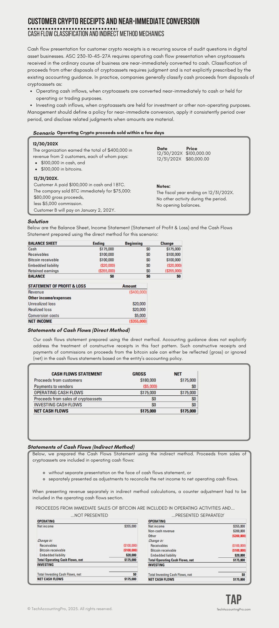 The cash flow presentation for customer crypto receipts remains a recurring audit question in digital asset businesses. ASC 230-10-45-27A requires operating cash flow presentation when cryptoassets received in the ordinary course of business are near-immediately converted to cash. The example below summarizes common classification approaches and the mechanics of the observed indirect methods: