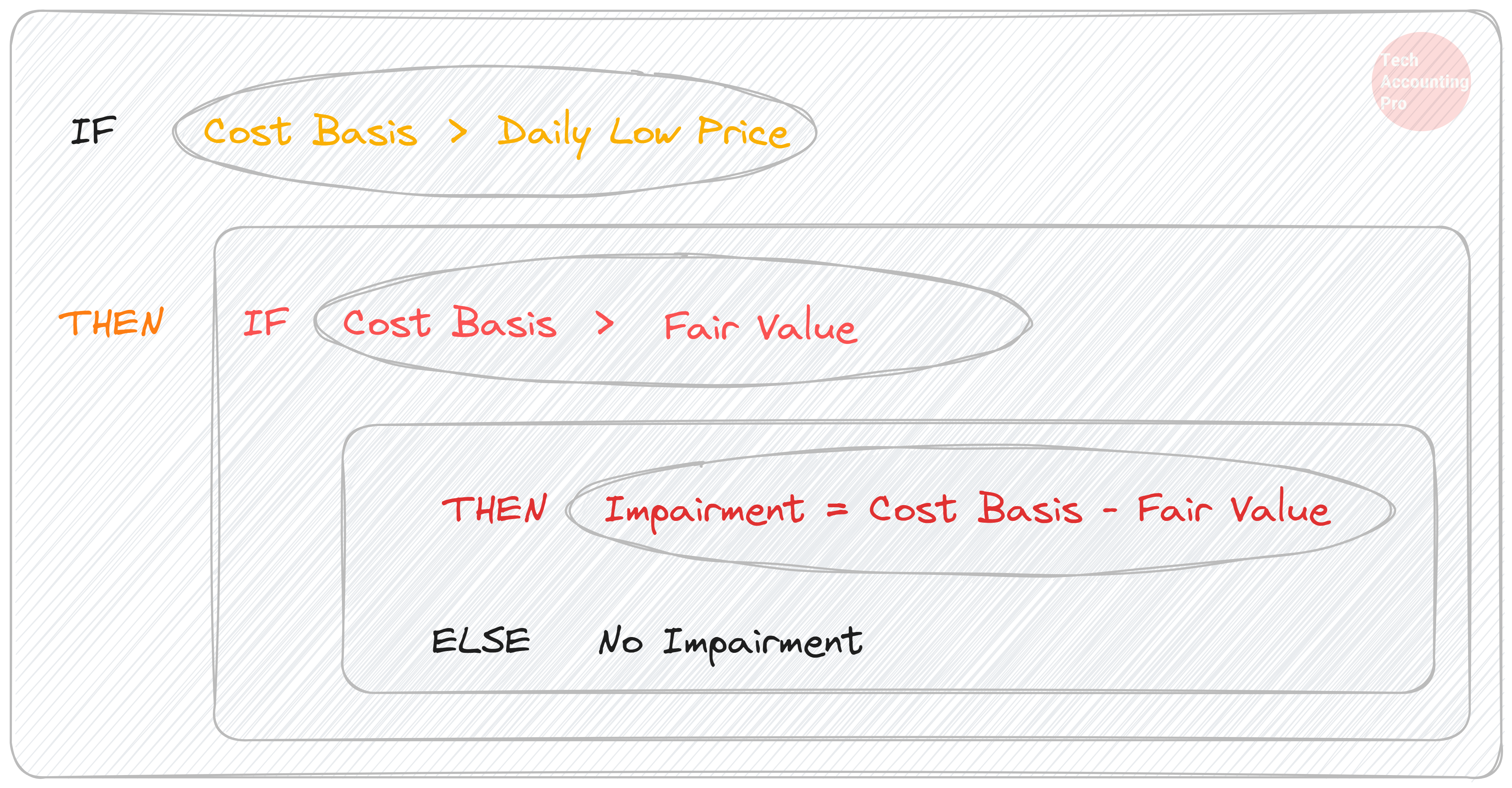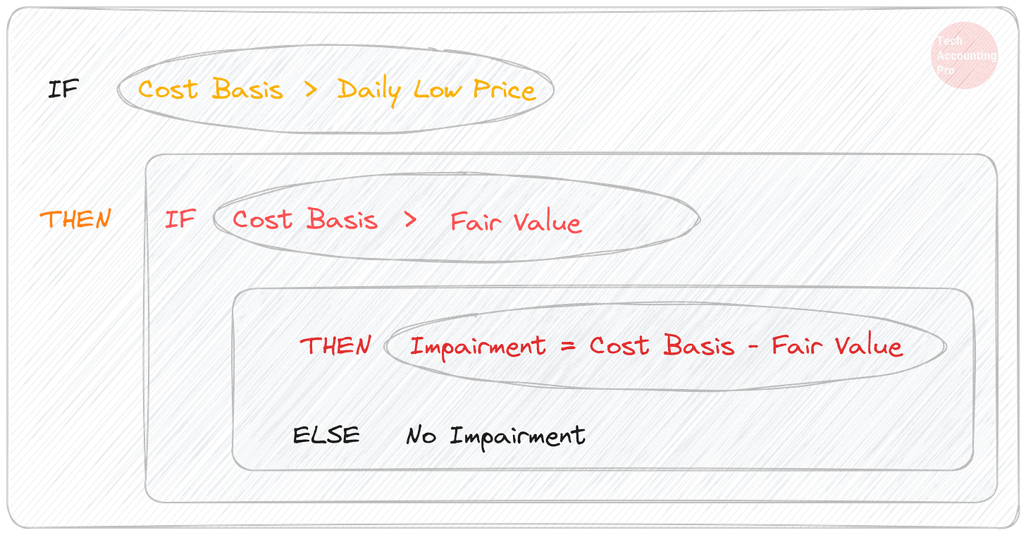 Whenever a daily lowest price falls below the current book value of a token, the impairment testing of digital assets is triggered. However, we need to understand that the metric that could serve as a trigger indicator of potential impairment does not by default represent the fair value used to calculate the impairment expense per FASB ASC 350-30-35-19: “The quantitative impairment test for an indefinite-lived intangible asset shall consist of a comparison of the fair value of the asset with its carrying amount. If the carrying amount of an intangible asset exceeds its fair value, an entity shall recognize an impairment loss in an amount equal to that excess. After an impairment loss is recognized, the adjusted carrying amount of the intangible asset shall be its new accounting basis”.