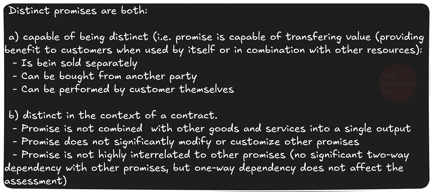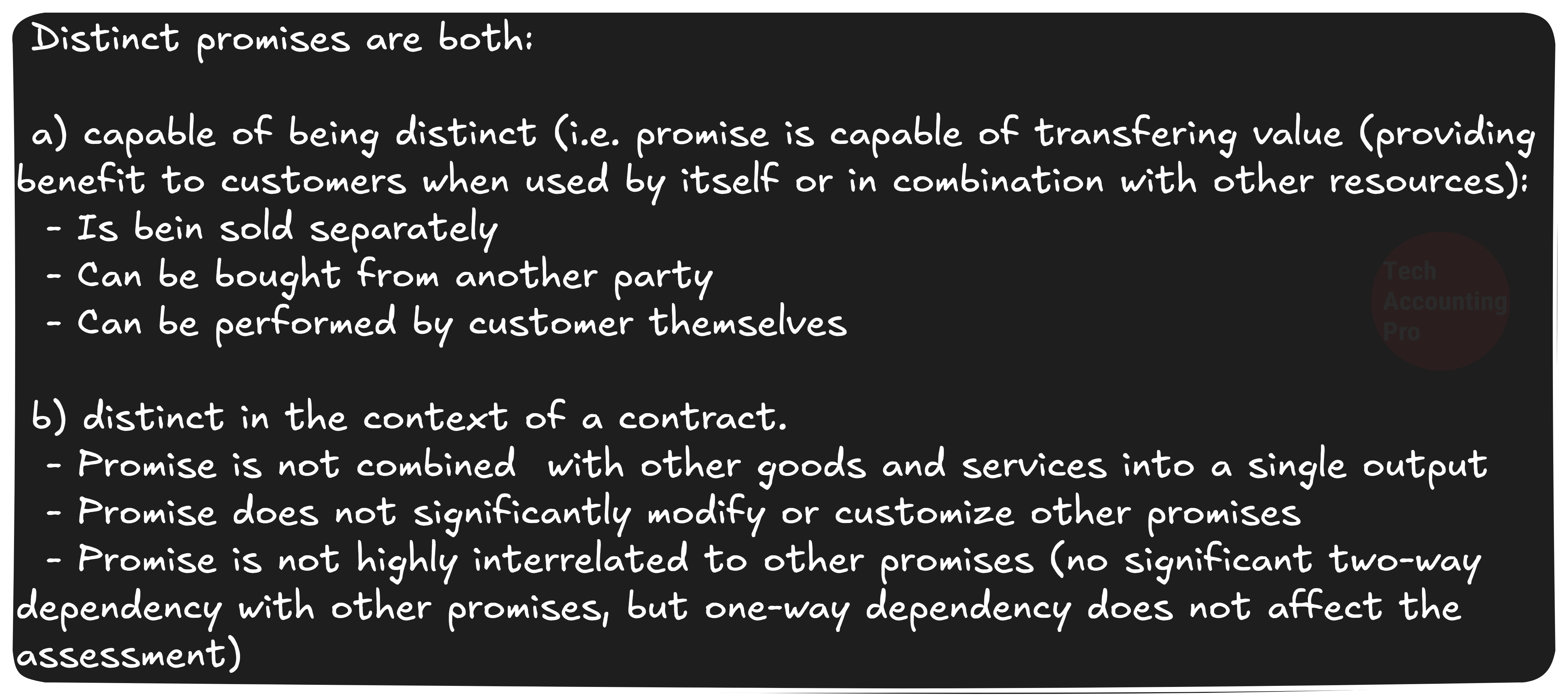 Now we need to evaluate whether identified promises are distinct. As per FASB ASC 606-10-25-19, a distinct performance obligation should meet both of the following criteria: