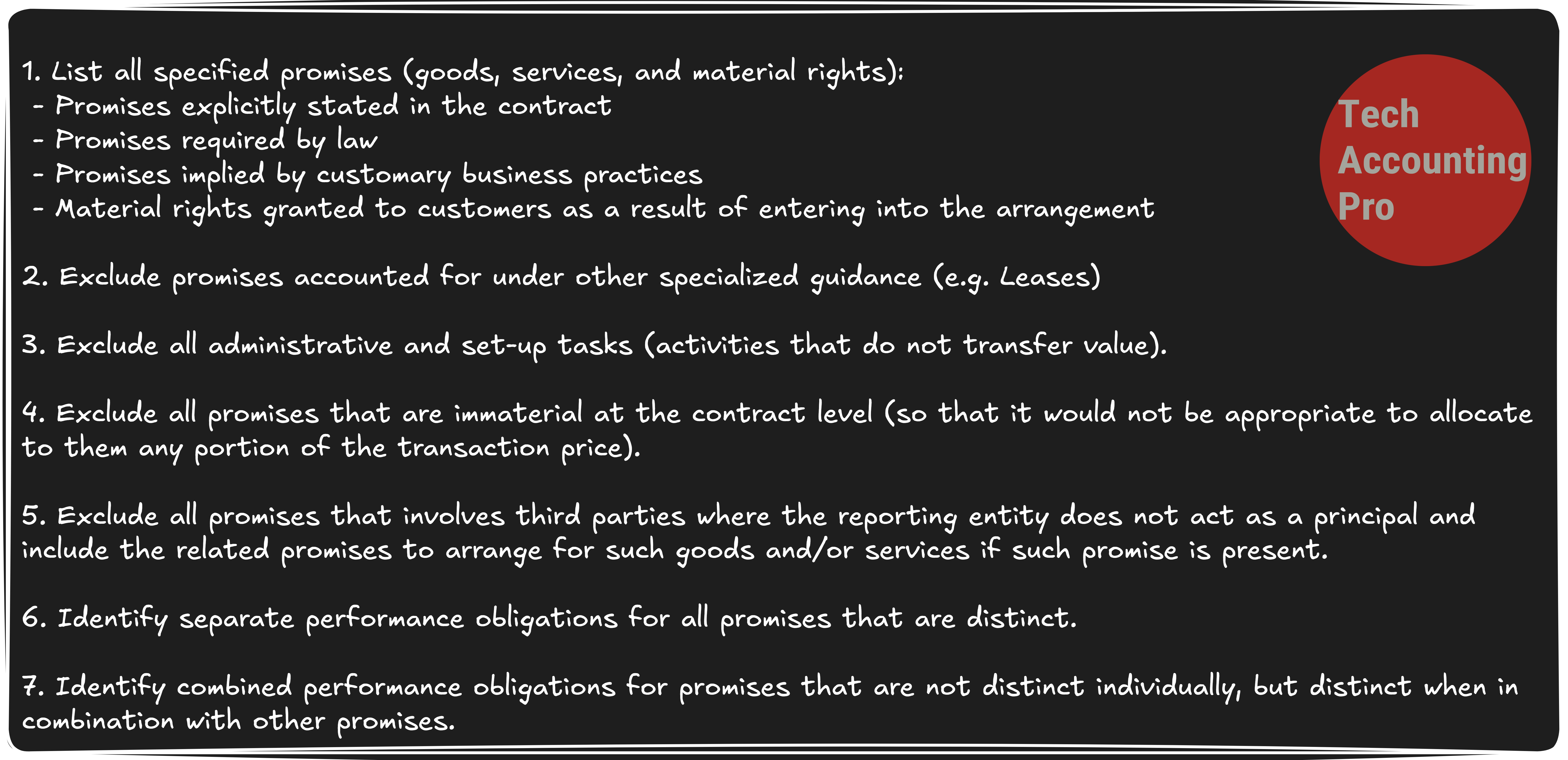 The process of identifying performance obligations often feels like a black box, where the output may seem disconnected from the input. It frequently appears that some goods and/or services have been omitted from the analysis, and without knowledge of the nuances of ASC 606, it can be challenging to understand why this is happening. To address this issue, I have created the following process to help ensure the complete identification and assessment of promised goods and services: